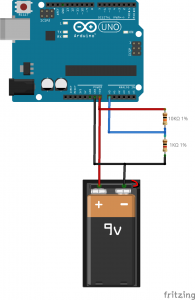 Dalam contoh ini saya menggunakan baterai kotak 9Volt. Untuk pembacaan tegangan baterai, sebagai penyetaraannya digunakan resistor pembagi tegangan dengan nilai 1KΩ dan 10KΩ (toleransi 1% dan kehilangan arus 0.8mA). Keluaran resistor pembagi tegangan menghasilkan tegangan 0.818 Volt jika tegangan baterai 9V.