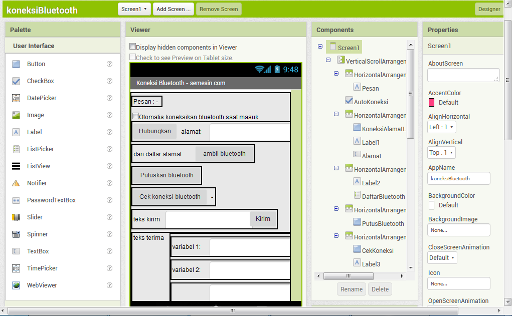 Daftar perangkat bluetooth yang terhubung ke android bisa diambil sebagai referensi alamat. Sebelum digunakan, elemen ‘listPicker’ digunakan sebagai penampung daftar bluetooth yang tersedia.