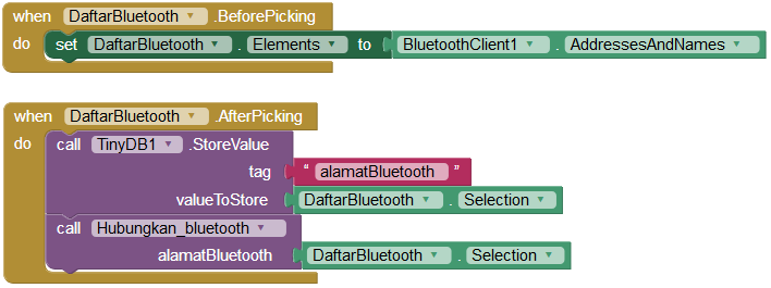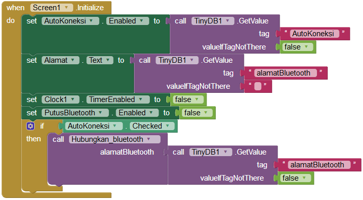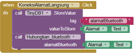 Apabila sistem menghubungkan bluetooth dibuat otomatis, maka bluetooth akan dihubungkan keserver dengan alamat yang tersimpan sebelumnya pada database ‘TinyDB’. Pemanfaatan database ini adalah untuk otomatisasi data saat aplikasi app dibuka tanpa perlu disetting ulang, cukup menggunakan settingan terakhir.