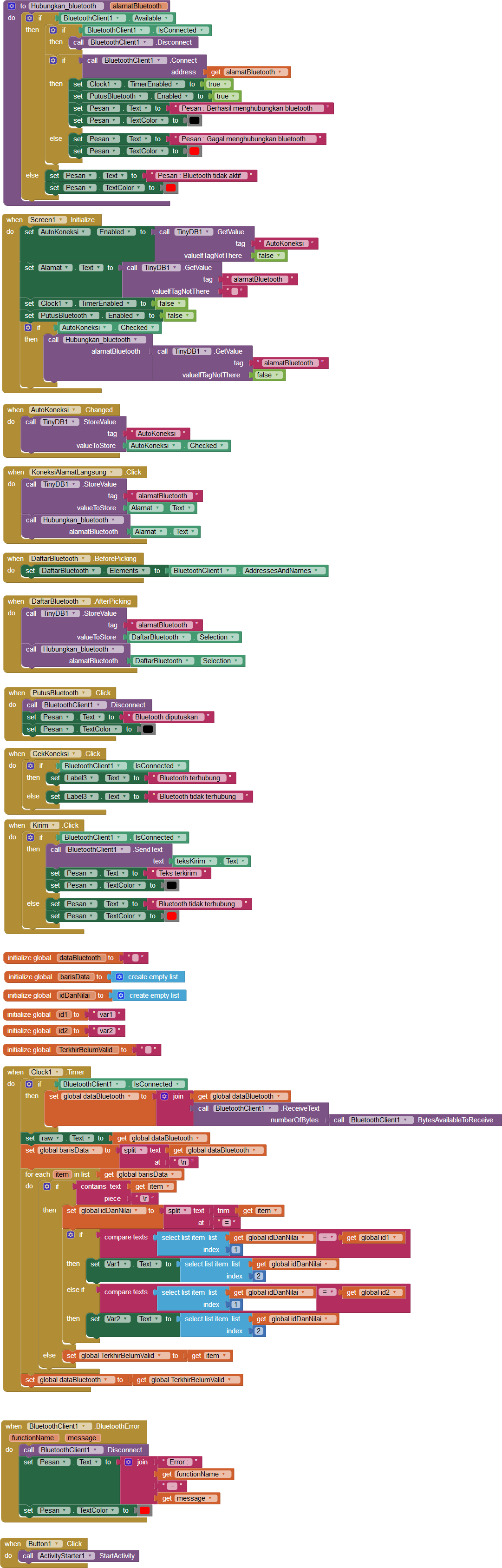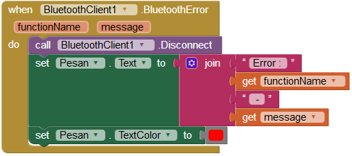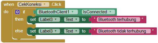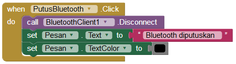 Fungsi ‘bluetoothClient.BluetoothError’ akan mendeteksi jika terjadi kegagalan bluetooth seperti kesalahan dalam proses menghubungkan, mengirim atau menerima data. Blok diatas akan mengirimkan pesan kepada pengguna melalui label ‘pesan’.