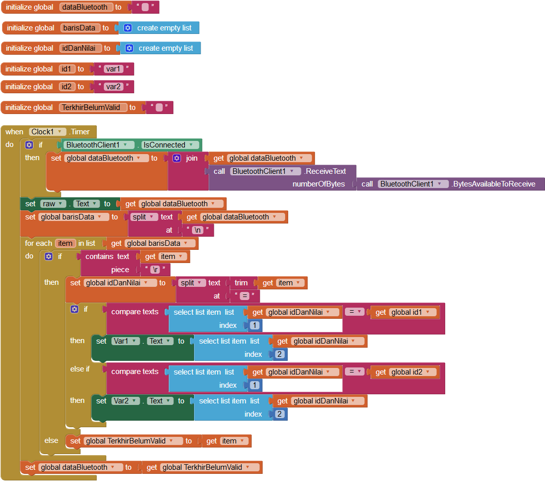 Dengan bantuan ‘clock.Timer’, setiap interval waktu dilakukan pengecekan apabila ada data yang diterima lewat bluetooth, kemudian mengambilnya dengan fungsi ‘bluetooth.ReceiveText’.