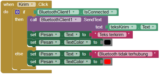 Jika ada data yang dikirim melalui bluetooth, data tersebut bisa dideteksi dengan fungsi ‘bluetoothClient.SendText’ seperti pada block berikut :
