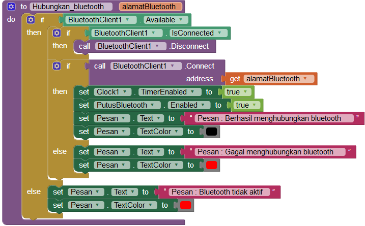 Prosedur ‘Hubungkan_Bluetooth’ ini bisa dipanggil dengan variabel ‘alamatBluetooth’ yang berisi alamat unik bluetooth. Sebelum dihubungkan prosedur akan mengecek status ‘bluetooth.available’, jika aktif, dilanjutkan dengan pengecekan status ‘bluetooth.IsConnected’, dan mematikan bluetooth jika sedang terkoneksi.