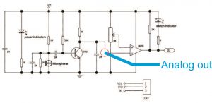 Output analog out pada prinsipnya adalah output mic setelah pre-amp. maka pada pcb biru yang tidak ada pin analog outnya bisa diambil pada titik berikut: